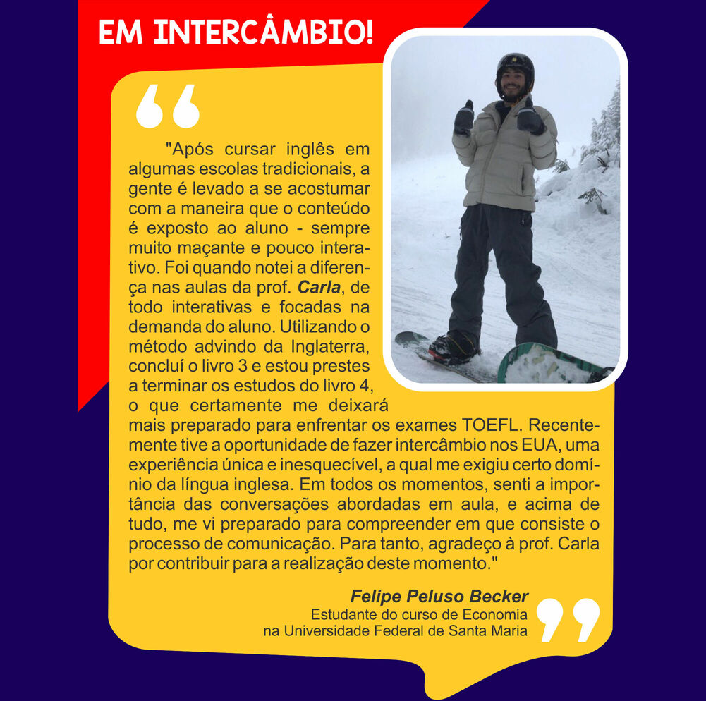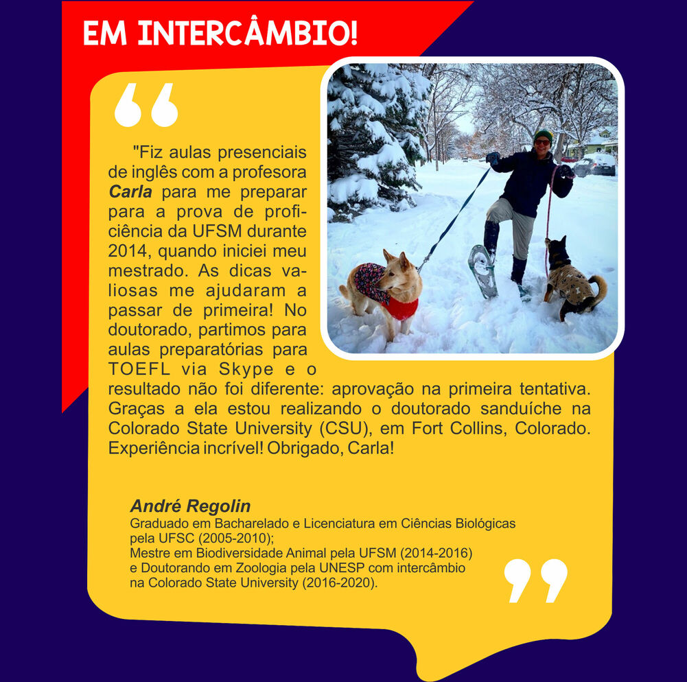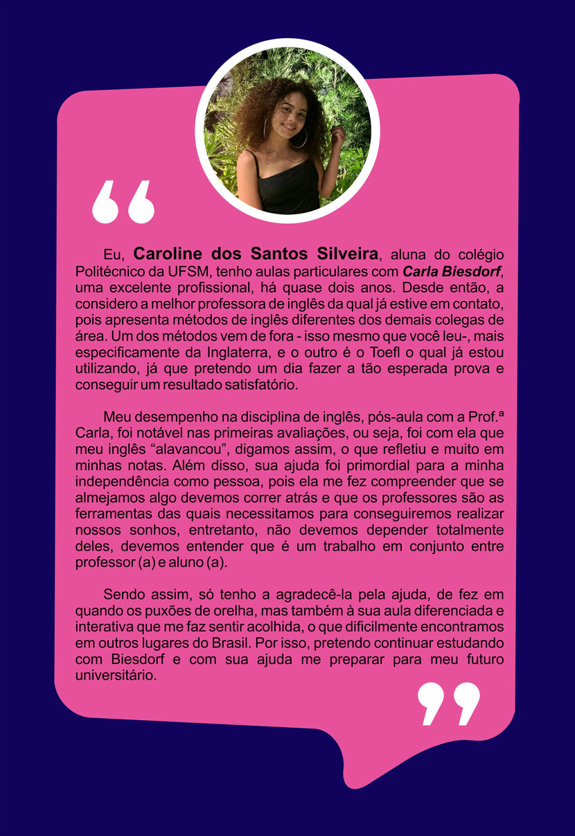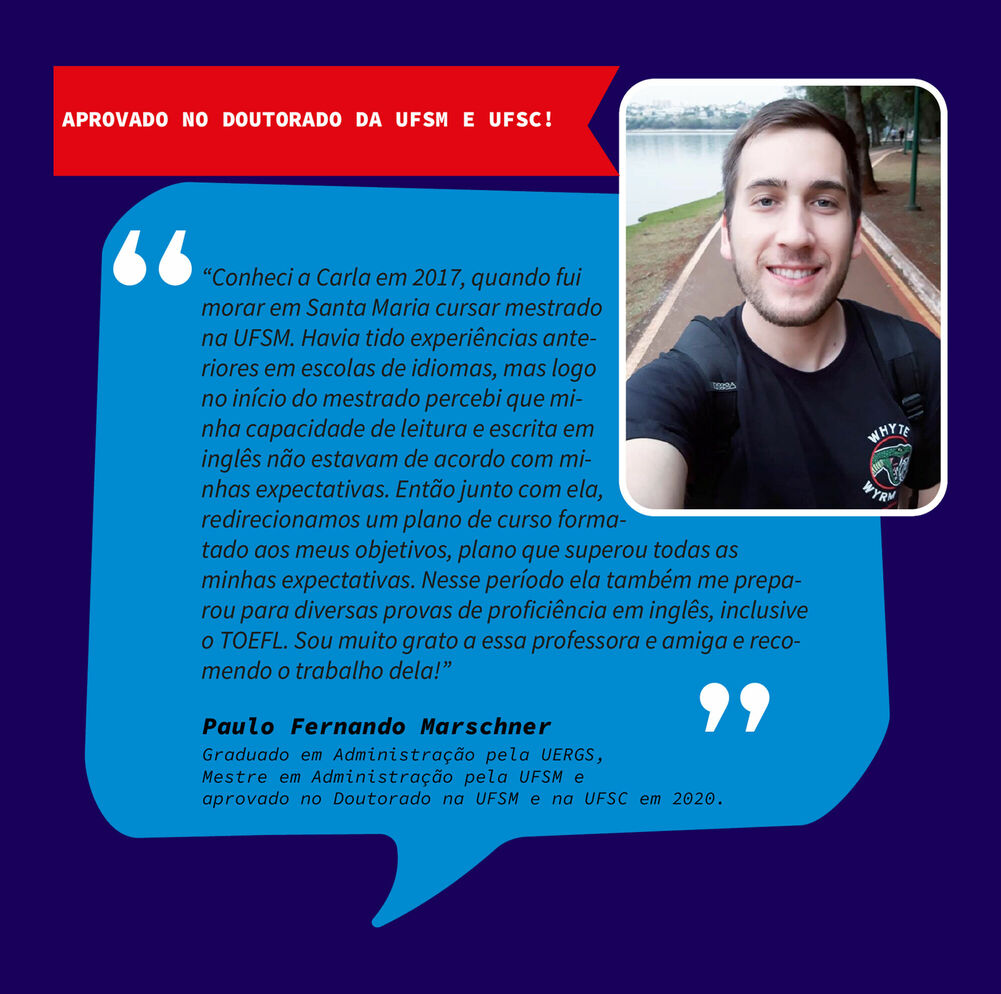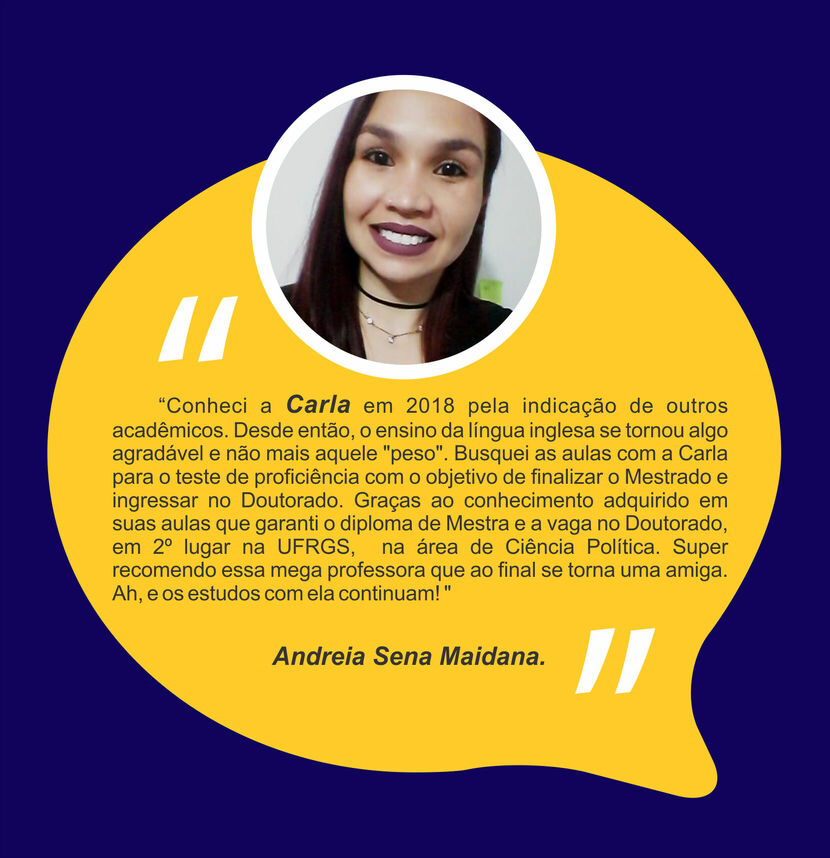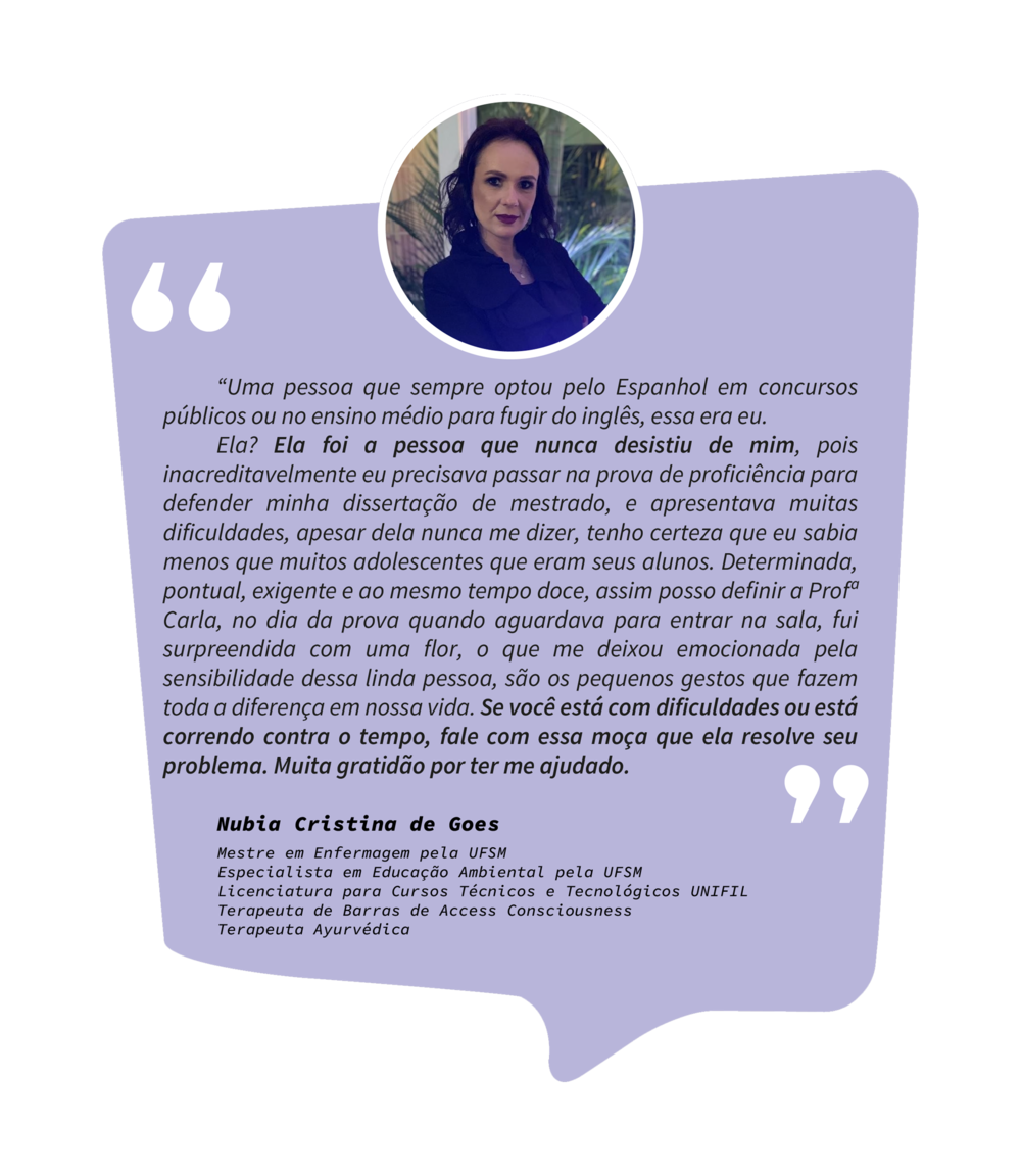 Ensino Inglês há 20 anos. No ensino fundamental realizei intercâmbio em uma escola americana na Tailândia. Já no ensino médio o intercâmbio foi em Londres, na Inglaterra. Na Graduação fui bolsista Erasmus Mundus na Grécia e premiada pela Mitacs com bolsa de estudos no Canadá. Lá fui convidada para estudar o Mestrado com bolsa de estudos integral. Por esse motivo sou também consultora de intercâmbio, auxiliando candidatos com suas cartas de motivação e análise de currículo. Conheço a China, Cingapura, África do Sul, Alemanha, Israel, Palestina, França e tenho paixão por viajar!