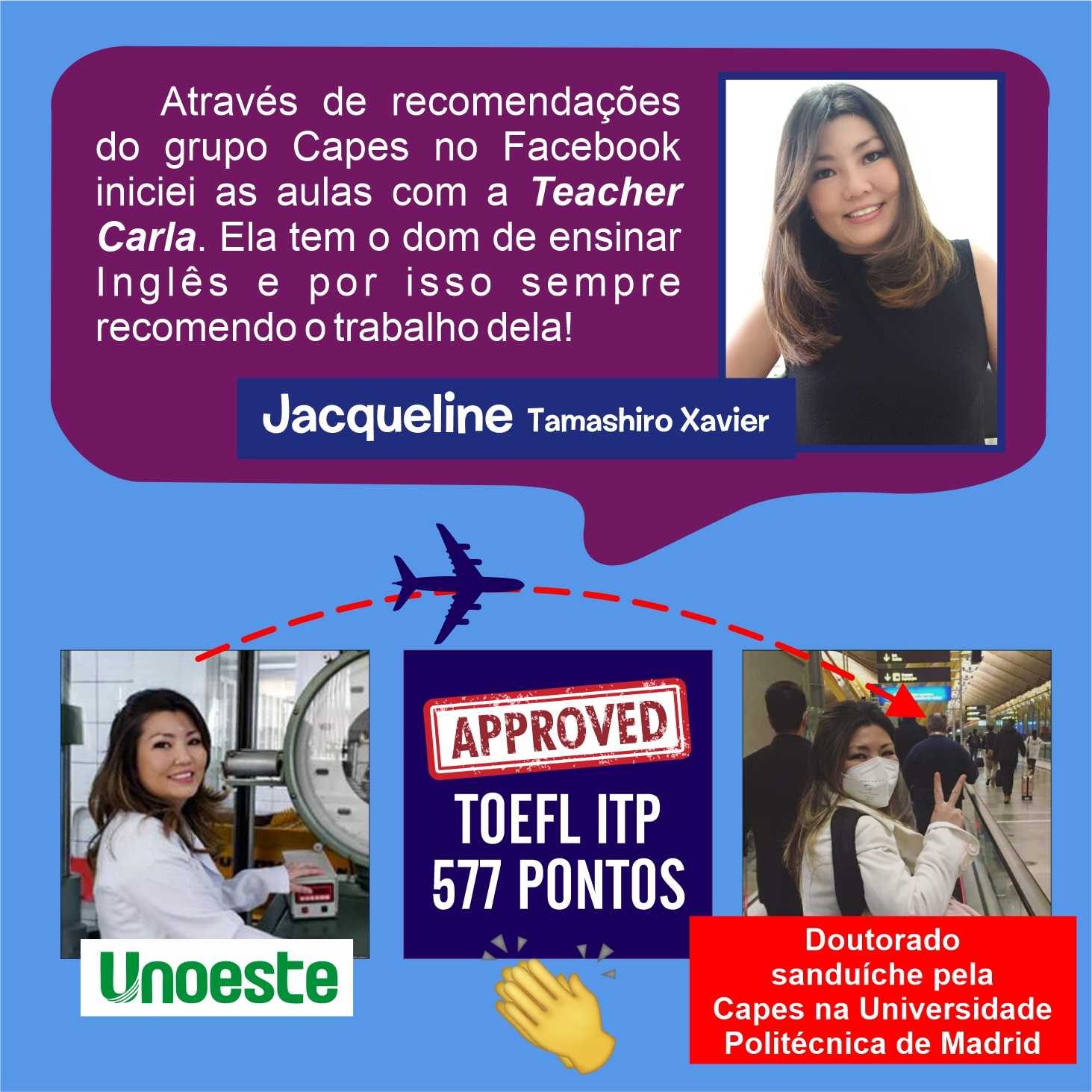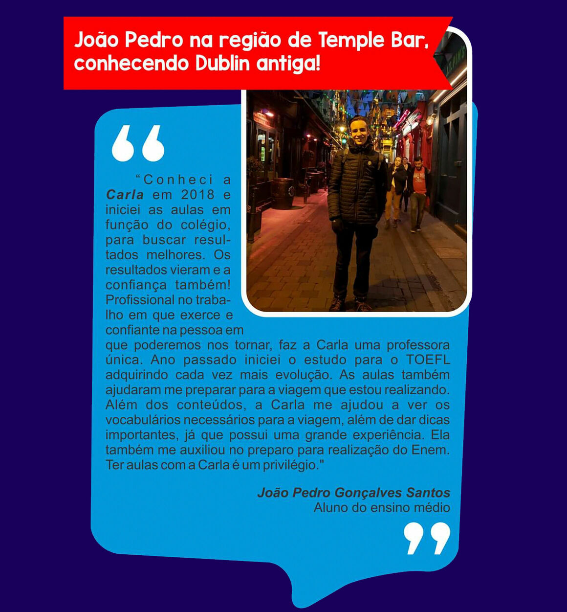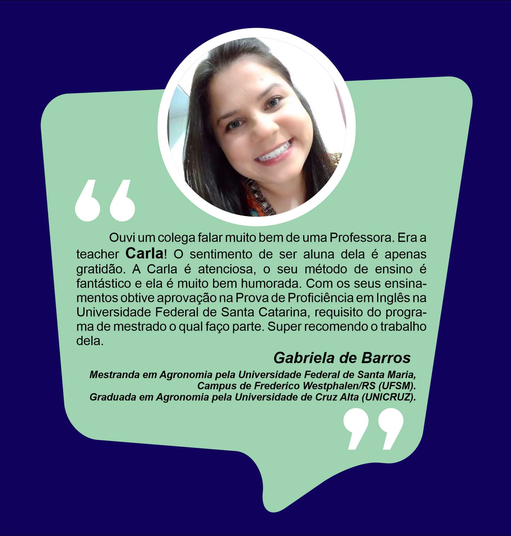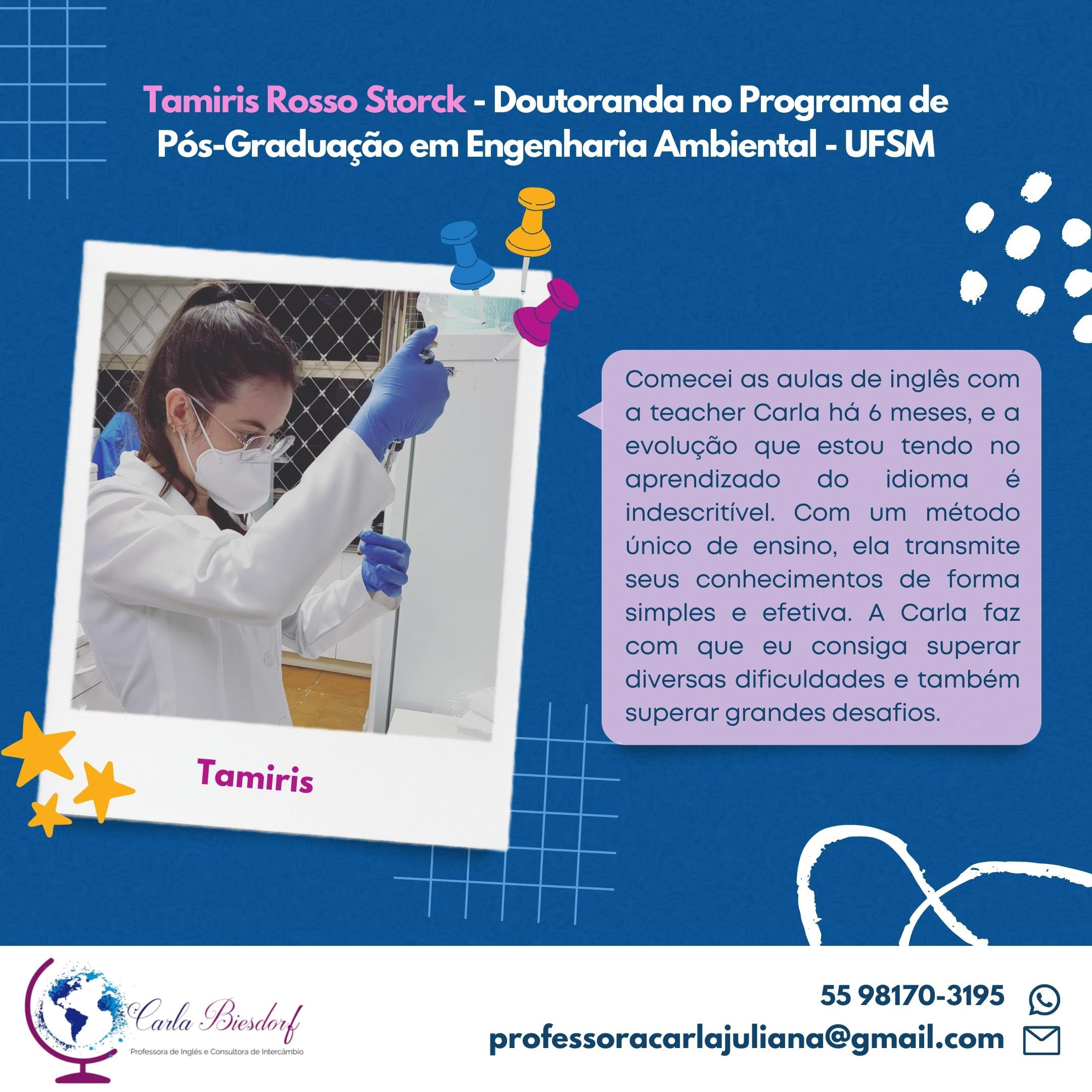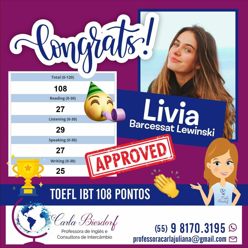 Ensino Inglês há 20 anos. No ensino fundamental realizei intercâmbio em uma escola americana na Tailândia. Já no ensino médio o intercâmbio foi em Londres, na Inglaterra. Na Graduação fui bolsista Erasmus Mundus na Grécia e premiada pela Mitacs com bolsa de estudos no Canadá. Lá fui convidada para estudar o Mestrado com bolsa de estudos integral. Por esse motivo sou também consultora de intercâmbio, auxiliando candidatos com suas cartas de motivação e análise de currículo. Conheço a China, Cingapura, África do Sul, Alemanha, Israel, Palestina, França e tenho paixão por viajar!